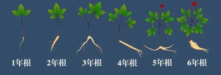 人參生長過程有一年生( 三花) 、二年生 ( 巴掌、五個葉 ) 、三年生( 二甲子) 、四年生 ( 燈臺子) 、四品葉、五品葉、六品葉等。